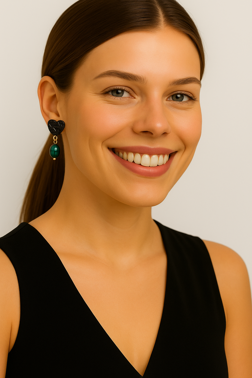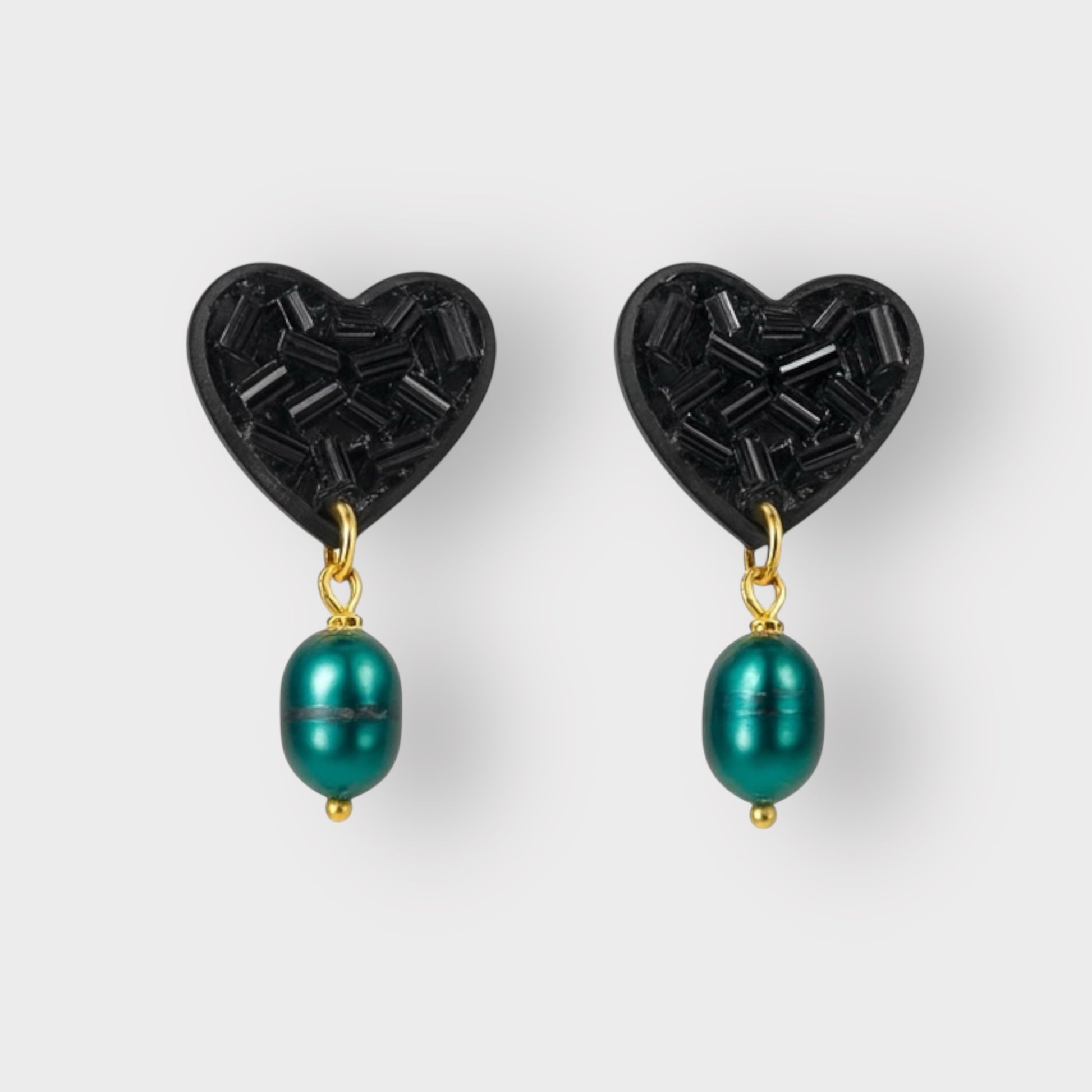 Pendiente con forma de corazón hecho a mano con resina en color negro, acero inoxidable y perla negra.
