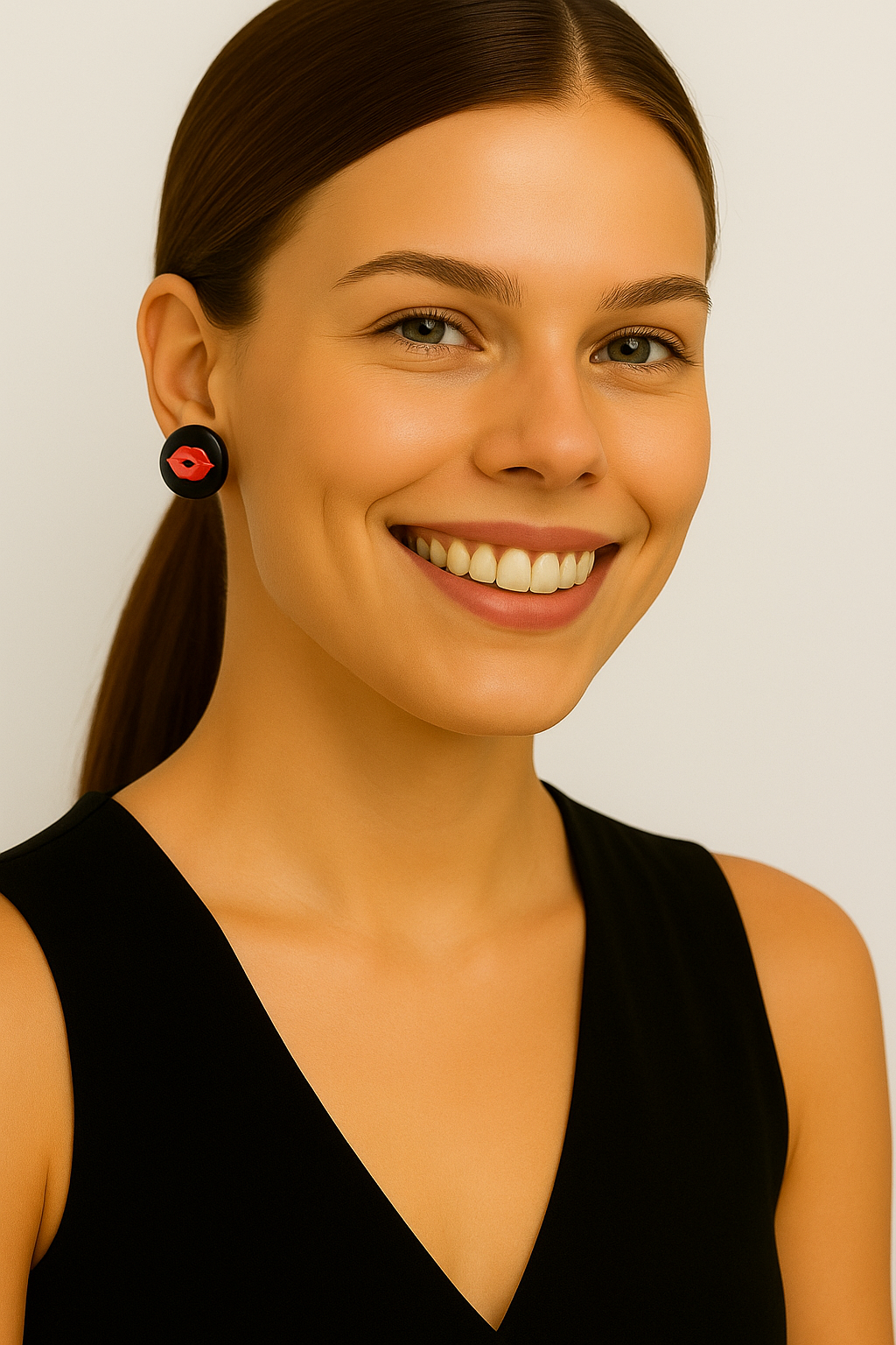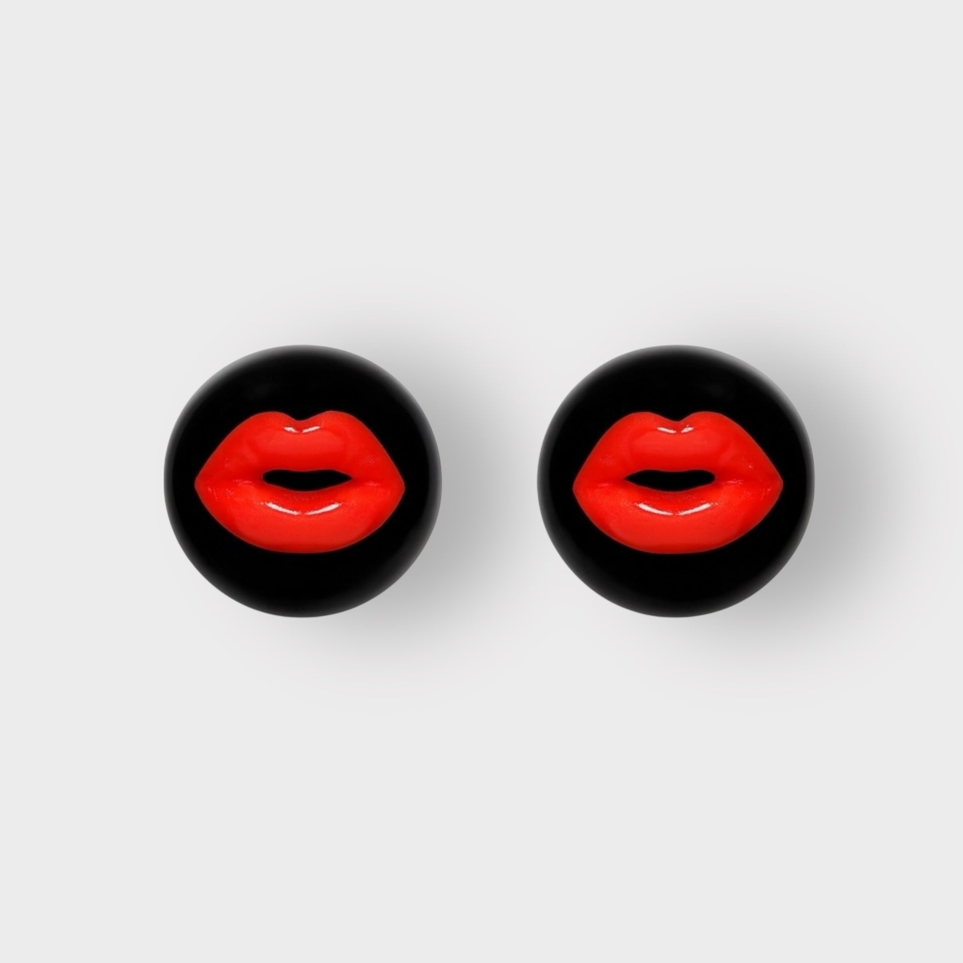 Divertidos pendientes hechos en resina negra con abalorio de labios rojos. Base del pendiente en acero inoxidable.
