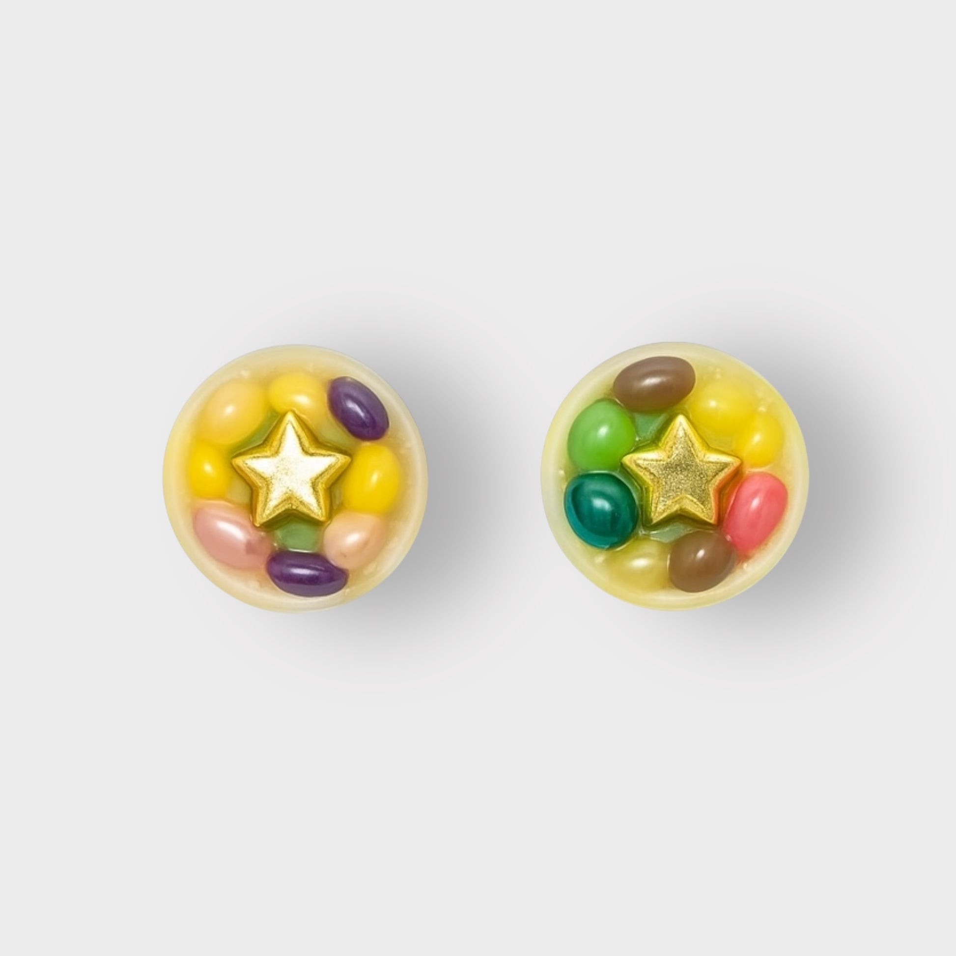 Pendientes con forma de botón realizados con resina, perlas de colores, acero inoxidable y opción con y sin estrella.