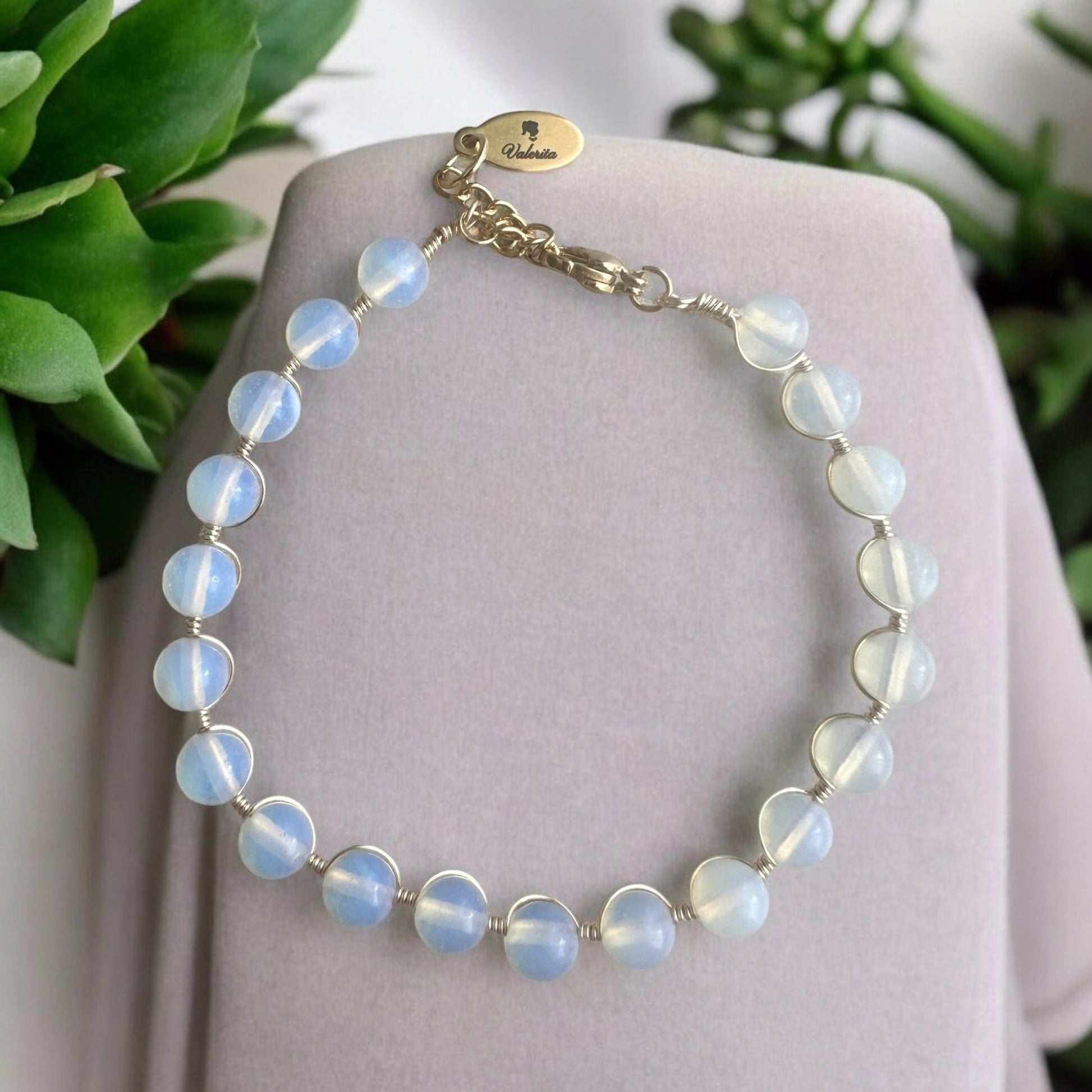 Pulsera hecha a mano con hilo de cobre bañado en oro y Ópalos . Cierre y alargador en acero inoxidable.