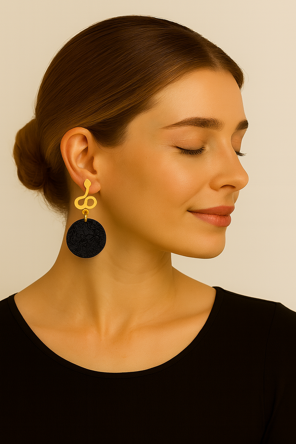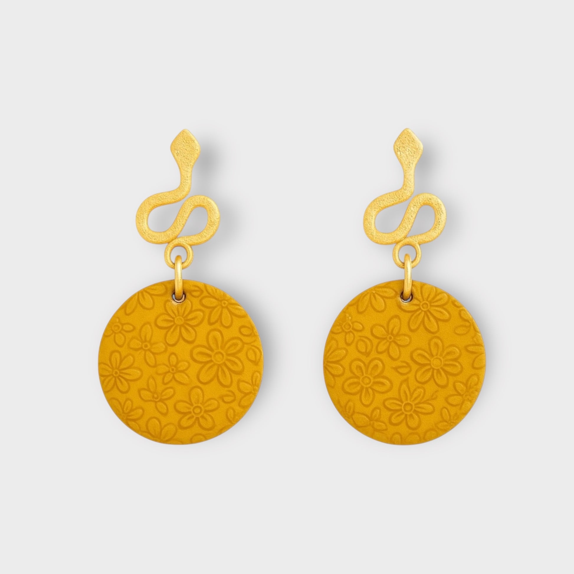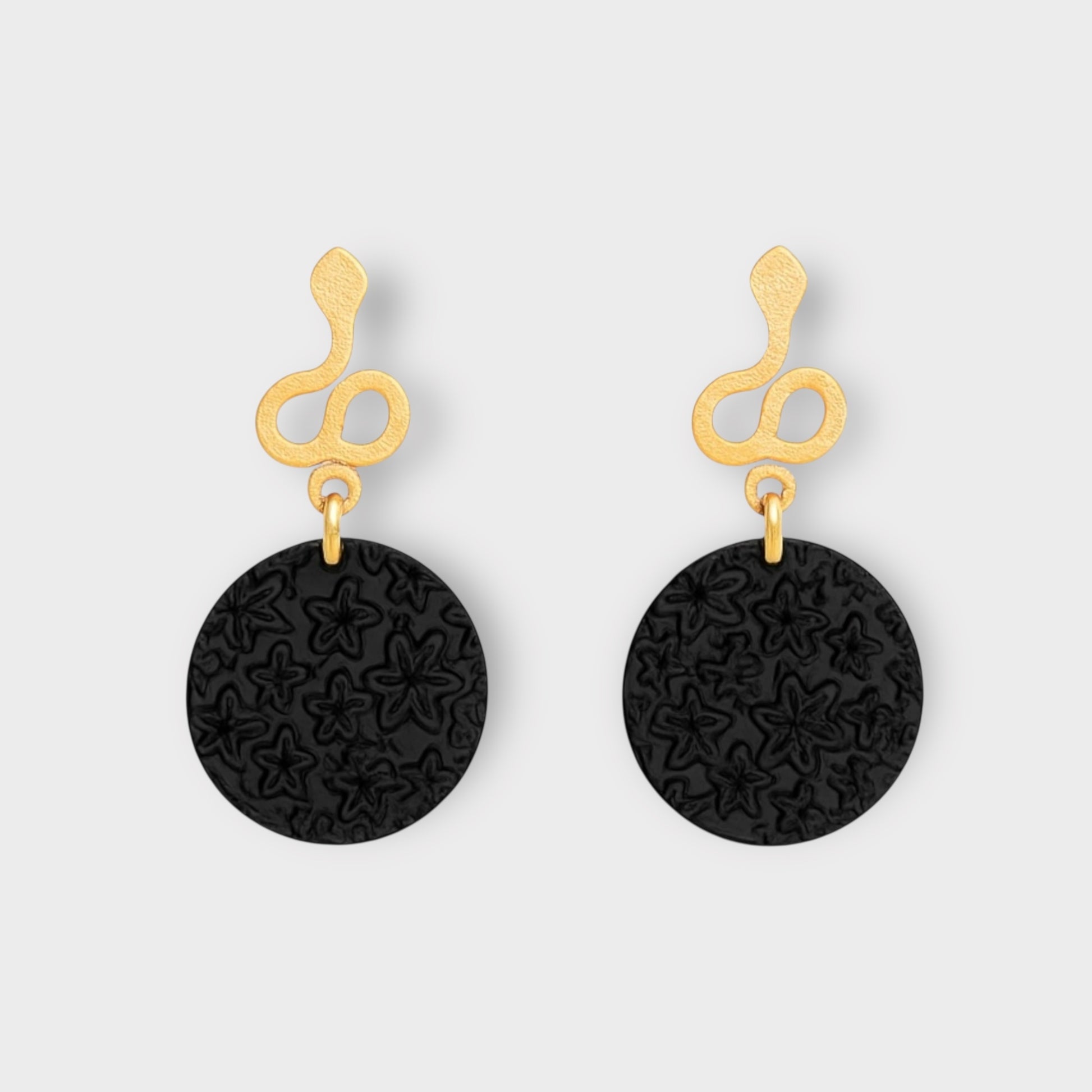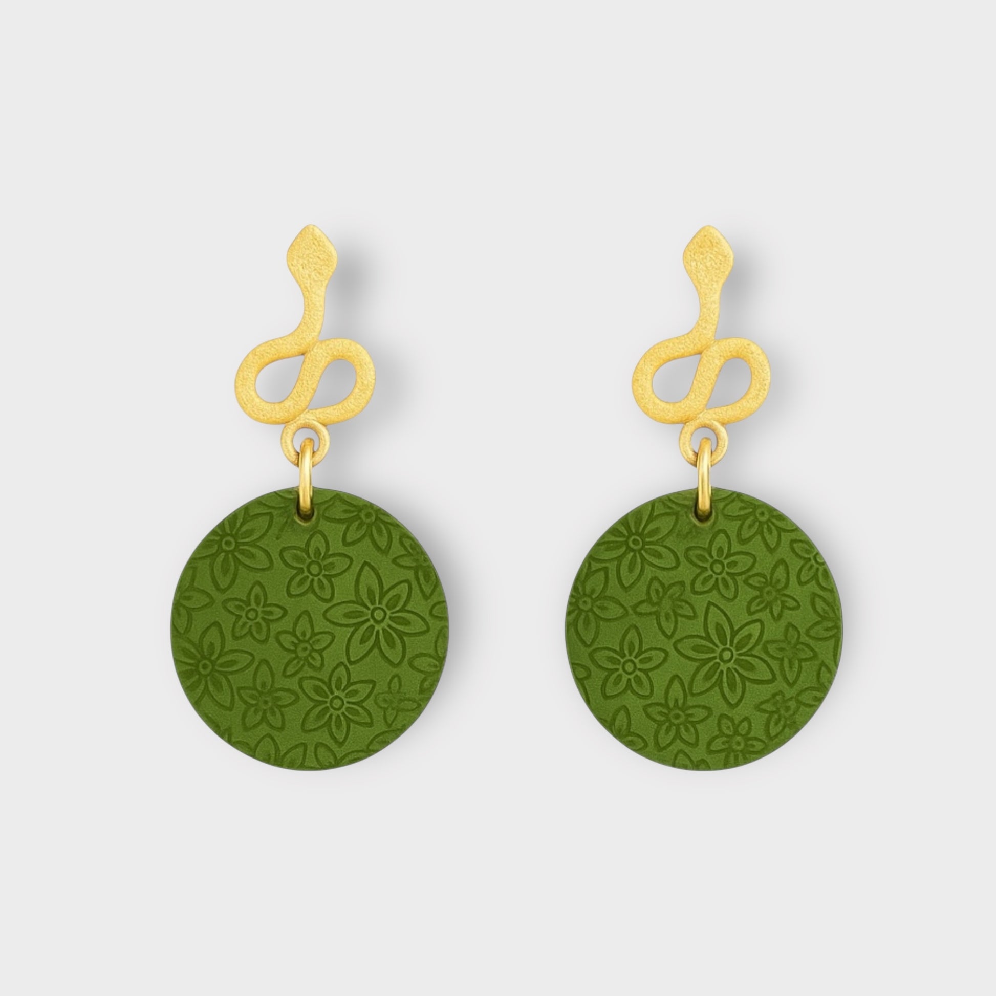 Pendientes hechos a mano con fornitura en forma de serpiente de Zamak hecha en España y base de arcilla polimérica y resina con relieve étnico, ideales para todos tus looks